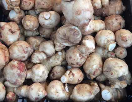A winter vegetable. Knobbly and fiddly to peel - although modern varieties are a lot less knobbly that they used to be. They disclour when peeled, so should be cooked immendiately or kept in water with lemon juice until one is ready to use them. They take about 15 minutes to cook in boiling water. Also excellent roast or sautéed, or raw, sliced thinly as a salad. After boiling they are a dirty white - not a very instagrammable vegetable.