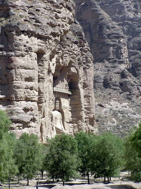 To get to Bingling Si, we had first to drive for about an hour and a half out to a dammed part of the Yellow River, and then to go for an hour by speed-boat along the lake created by the dam – a spectacular trip. The “caves”, up the sheer cliff-side of a river canyon, turned out to be much smaller than expected, some not more than a couple of feet square, and to be shallow recesses carved into the rock rather than real caves, each with a seated Buddha within, and many with wooden doors to protect them from further damage from the elements. There was one huge Buddha carved in the cliff, the only immediately striking work. The guidebooks spoke of a dizzying network of stairs and ramps to reach the individual caves, but this had just been replaced by a high quality paved walkway with elegant carved stone balustrades and an efficient one-way system, along which flowering plants and creepers had just been planted. We were extremely impressed by the huge investment that was being made in tourist infrastructure that was really in excellent taste, albeit slightly disappointed by the site.