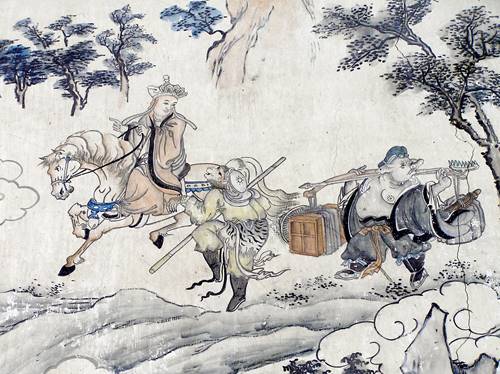 We had saved up the town’s main sight, a giant reclining Buddha, for the next day, to eke out such meagre cultural fare as existed. It was indeed most impressive, 34 metres long and the largest in China, but in restauro and covered in scaffolding, so we could do no more than glimpse giant toe-nails and huge draperies between poles of scaffolding. On either side, there stood half a dozen larger than life-size “holy warriors”, each with its own different characteristics – one was skeletally thin; another fat and jolly; one was black and fierce; and yet another was scratching his ear. We soon realised that this precise group of identifiable figures was reproduced in many Buddhist temples, but infuriatingly had no work of reference to explain what each represented. I had taken the precaution of purchasing a learned book about Buddhism before leaving London, but while it explained the doctrinal differences between the various Buddhist sects in tedious detail, it touched on the iconography hardly at all.