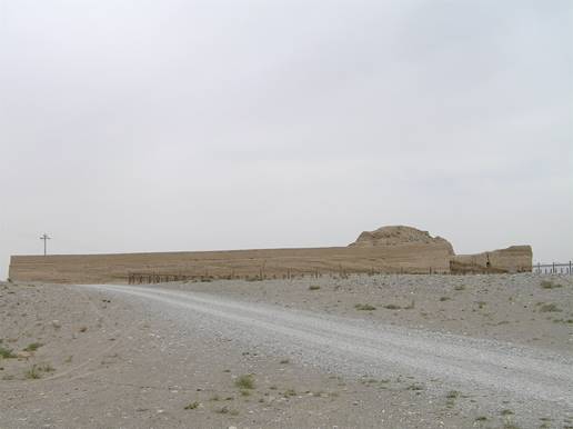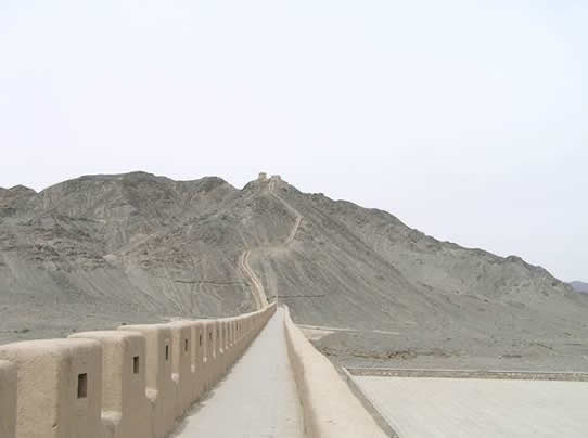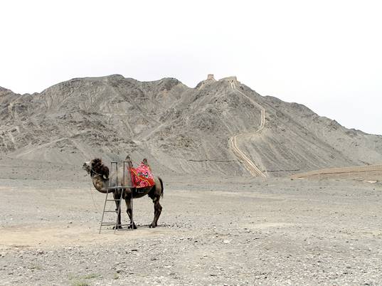 There is almost nothing for the tourist in Jiayuguan itself, but it is the jumping off place for two particularly spectacular desert sites: the last fortress of the Great Wall, and the very end of the Wall itself. The fortress was built by the Ming in 1372, strategically between the snow-peaks of the Qilian Mountains to the north and the forbidding black Mazong Mountains to the south. It is some 5000km from the eastern end of the wall, and must have seemed like the end of civilisation to the unfortunate garrisons who had to man it, as they looked out onto the endless desert to the west, inhabited only by hostile sharp-shooting nomads. The fortress is huge, with an inner and outer wall, and must have accommodated hundreds of men. Apparently the Ming imported Han peasants from the east to set up farms on the China-side of the wall (where there are oases), both to provide food for the garrison and to help “civilise” the country – as civilisation to the Chinese is synonymous with sedentary agriculture. The green on one side of the wall must have made the pitiless desert on the other side seem yet more desolate and eerie.