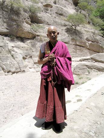 For an extra payment, we were offered a 10-minute trip in a topless four-wheel drive vehicle up the empty river bed at the foot of the cliff to visit a working Buddhist monastery on a peaceful hillside. We found the elegantly red-robed monks only too ready to leave their task (chopping cypress leaves to burn for incense) to show us round the mostly rather tawdry statues and paintings. In front of one Buddha, there were a group of little figurines in what looked like wax, perhaps 6-9 inches tall. They turned out to be ex-votos made by the pious out of mutton fat (and there was indeed a slight rancid smell). I asked what happened to them in the long run, and the monk answered rather sheepishly that the monks ate them. On our way down, we offered one of the monks a lift and took his photograph, in preparation for which he carefully adjusted his robe to a more becoming angle.