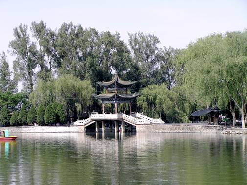 By the time we had seen the reclining Buddha and the other attractive buildings in the temple complex (including a little museum of paintings and drawings where we were told by a notice that “wandering among them, one can experience spiritual peace and harmony in the refined artistic atmosphere” – the Chinese are rather keen on telling one how one should be feeling), the weather had pulled itself together and we were feeling a lot more cheerful. Like most of the cities that we visited, there was a park full of little pagodas, bridges, cafés and old men gambling. There was a lake in the middle and we hired a pedalo boat. We were able to go right up to two terns sitting on a post in the lake. Many of the other boats on the lake were occupied by students from the nearby university, who would pedal themselves rather alarmingly to within feet of our boat and ply us with questions in fractured English.