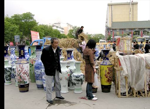 Almost all the restaurants are in “Food Street”, an attractive pedestrianised way with lots of red lanterns (the traditional sign of a restaurant). At the end there was an open area where on Saturday evening some men arrived with a truckload of pottery vases, wrapped in strong-smelling damp straw. By Sunday morning they had all been unbundled from their straw and were on sale. Many of them were huge – up to five feet high. They were decorated in both traditional and modern styles and one had to admire the handiwork that had gone into them, but sadly none of them was really attractive, either in shape or decoration.