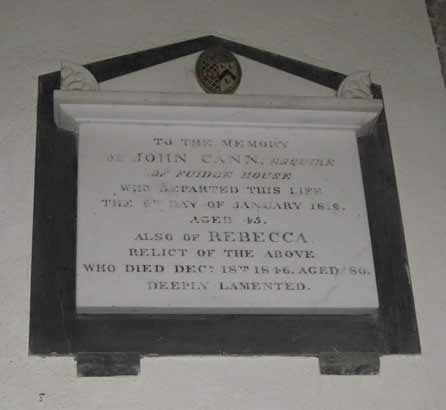 The Canns are a large and ancient Devon family, spread throughout the county. Somebody has even prepared an extremely fanciful family tree that traces the ancestry of the Spreyton Canns back to a Jean Canne of Chartres, a military companion of William the Conqueror. In fact, it seems that they were no more than yeoman farmers made good. There were Canns in Spreyton at least as early as the 16th century, and by the 17th and 18th century they appear to have become substantial landowners. Some of their wealth came from their ownership of the Drewsteignton lime quarries, which they acquired in 1772 and developed into a highly productive business. They were based at Fuidge, a typical Devon long-house deep in the country south of Spreyton village. In the 18th century, when they became rich, the Canns added an elegant double-bowed front to the house, and built a fine serpentine wall in the garden, making it the most imposing residence in the parish. There were even fish-ponds. Their total estate amounted at that time to some 1500 acres19. There are several monuments to the Canns in Spreyton church.